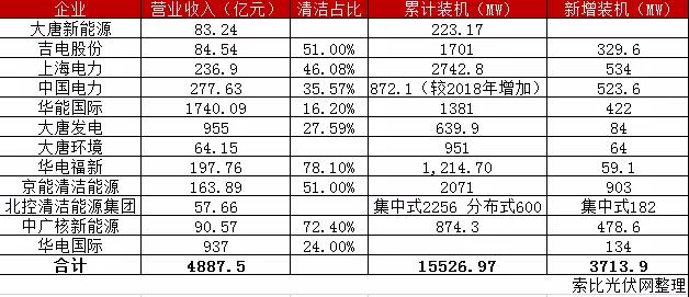2020年作為“十三五”的收官之年,也是電力集團實現(xiàn)清潔能源轉型的關鍵之年,在實現(xiàn)清潔能源轉型上,各大央企國企也瞄準了光伏這一領域頻頻發(fā)力,索比光伏網(wǎng)整理了近期國企財報裝機數(shù)據(jù),僅12家(不完全統(tǒng)計)“國家隊”企業(yè)新增裝機便達到了3.71GW,累計裝機15.52GW。企業(yè)裝機清潔占比逐步提高。