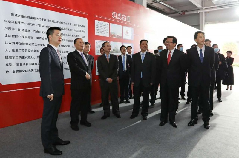 2020年4月21日,通威眉山一期高效太陽能電池項目正式建成投產,四川省人民政府副省長李云澤,省經濟和信息化廳二級巡視員肖世同,甘孜州委書記劉成鳴,州委副書記、州政府州長肖友才,州政府副州長杜德清,眉山市委書記慕新海,市委副書記、市政府代理市長胡元坤,市委副書記、天府新區眉山黨工委書記黃劍東,市委常委、市委秘書長汪樹槐,市政府副市長冉登祥等領導出席。十一屆全國政協常委、全國人大代表、通威集團董事局主席劉漢元,通威集團董事長管亞梅,通威集團總裁禚玉嬌,通威集團黨委書記、通威股份董事長謝毅,通威股份副董事長嚴虎,通威集團副總裁管亞偉等出席儀式。