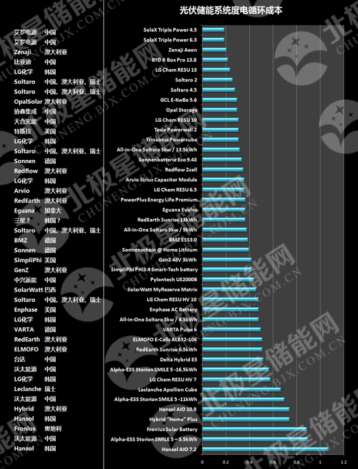 列入產品最多的有兩家企業,分別是一家中國、澳大利亞和瑞士合資企業Soltaro、和韓國的LG化學,分別有五款儲能系統,成本價格分散于高中低檔各個成本區間。