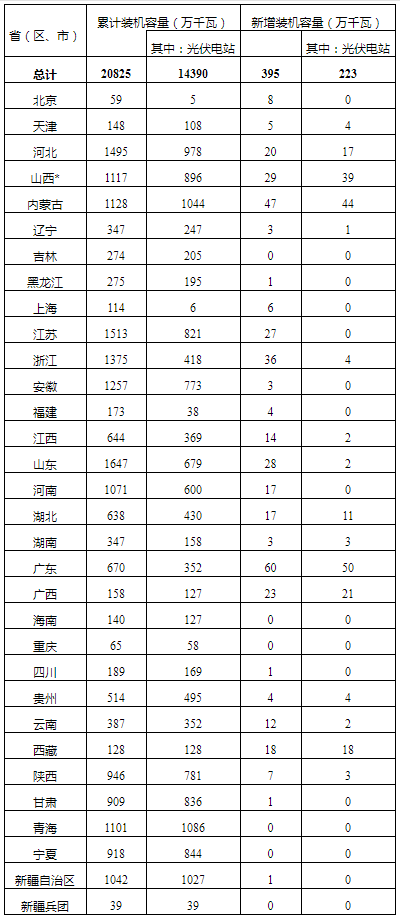 注:1.*山西一季度分布式光伏新增核減10萬千瓦;