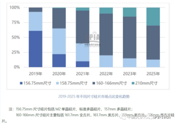 近年來,為獲得更高組件功率以降低單位成本,企業(yè)紛紛發(fā)布158.75mm、161.7mm、163mm、166mm以及210mm 等大尺寸硅片,且逐步投入到下游制造中。據(jù)CPIA數(shù)據(jù)顯示,未來5年,156.75mm將逐漸淡出市場,160~166mm尺寸占比將逐步上升。