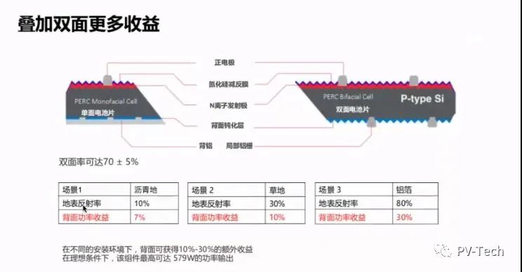 金鵬表示:“MBB疊加半片是現(xiàn)階段廣泛應(yīng)用的技術(shù),另外結(jié)合大硅片,在功率的提升上表現(xiàn)非常顯著。大尺寸硅片在功率上的提升表現(xiàn)非常明顯。目前,市面上組件的雙面率可以達到75%,在不增加組件成本的前提下,可額外獲得10~30%的收益。