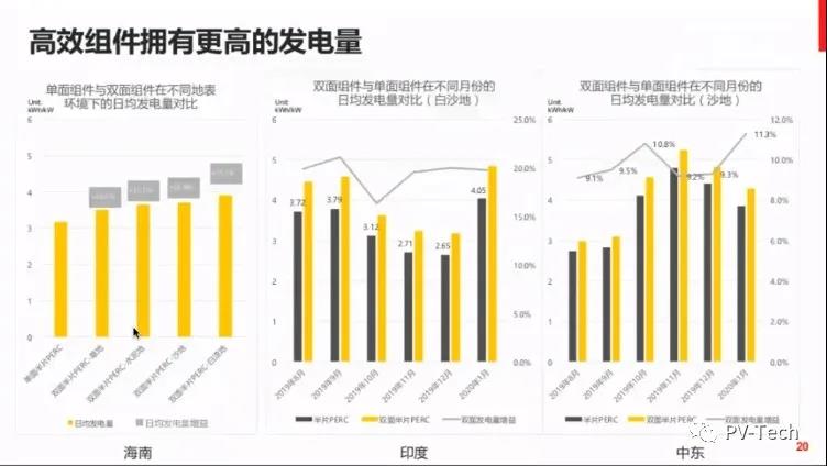 未來大型地面電站,雙面組件應(yīng)用也會越來越多。同時高效組件能節(jié)省更多土地面積,以100MW光伏系統(tǒng)為例,可節(jié)省1.2%的土地面積,效益很可觀。”