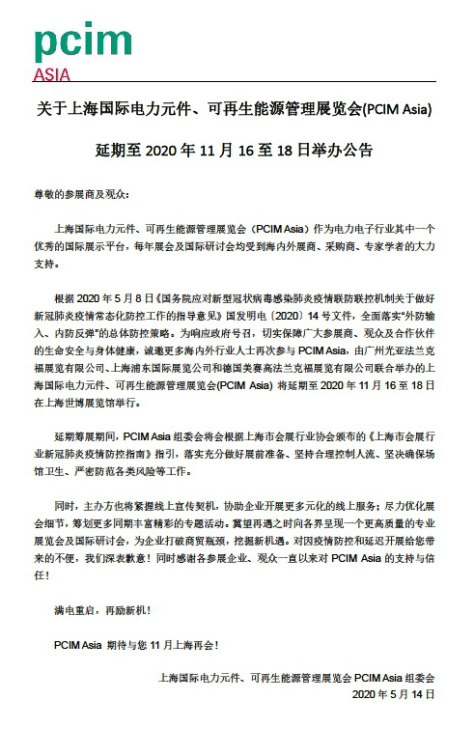 廣州光亞法蘭克福展覽有限公司副總經理梁志超先生就延期決定表示:“我們過去幾個月一直努力不懈,務求使展會能如期在7月舉辦。但是我們必須考慮到來自全球各地的展商及研討會嘉賓的健康狀況, 以及行業是否有充足時間進行復蘇等因素, 因此我們與業內涉眾協商后決定將展會延期至11月舉辦。在年底辦展的風險相對較低,除了能提高更多海外專家參與的機會,也讓我們有更多時間準備舉辦一場全面的國際盛會。再者,2020年的PCIM Europe將以線上方式在7月7至8日舉行,我們認為有必要在今年內為業界提供直接見面交流的機會,這一點對協助行業復蘇至關重要。”