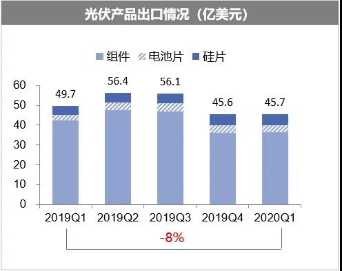 2020年一季度,我國光伏產(chǎn)品(硅片、電池片、組件)出口額達到45.7億美元,同比下降8%,環(huán)比增加0.2%。硅片、電池片出口額、出口量同比增長,單晶硅片出口占比進一步提高,出口量占比達到近80%;組件出口額達36.5億美元,同比有所下降;出口量達15.6GW,與2019年同期相比基本持平。
