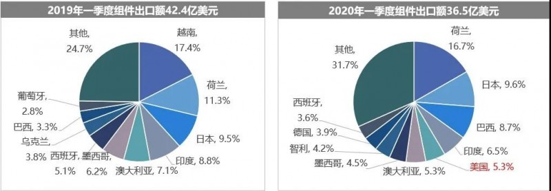 一季度,組件出口市場呈進一步分散趨勢,歐洲市場和拉美市場保持穩(wěn)定需求,荷蘭、日本、巴西、印度、美國、澳大利亞、墨西哥、智利、德國、西班牙上榜組件出口前十。值得一提的是,美國和越南在2020年一季度組件出口前十國家中“一進一出”:由于2019年12月美國宣布對雙面發(fā)電光伏組件豁免201法案下的進口關(guān)稅,一季度我國對美組件出口額達到1.94億美元,實現(xiàn)同比42倍以上增長,美國時隔十年后再次躋身中國出口市場前十;與此同時,受搶“630”補貼影響,2019年一季度越南一躍成為我國組件出口第一大市場;2020年一季度隨著正常需求的回歸,越南退出我國組件出口前十市場。