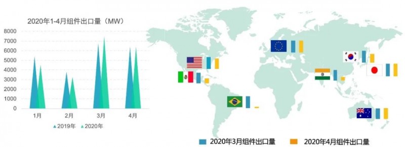 根據(jù)2020年1-4月組件出口數(shù)據(jù)來看,1-2月出口同比明顯下降,系春節(jié)及國內(nèi)疫情雙重影響,主要問題在于國內(nèi)物流幾近癱瘓導(dǎo)致光伏產(chǎn)品出口受限;3月出口量同比明顯上升,主要是因為國內(nèi)復(fù)工積極,2月積壓在海關(guān)的產(chǎn)品在3月一同清關(guān);4月國內(nèi)基本實現(xiàn)全面復(fù)工復(fù)產(chǎn),但此時正是海外疫情暴發(fā)期,雖然主要的光伏市場均采取了管控措施,但出口量同比并未有明顯減少,考慮到3月出口規(guī)模中包含了一部分本來應(yīng)該在2月出口的規(guī)模,因此4月環(huán)比受影響的程度并不高。從主要的GW級市場3-4月出口情況來看,雖然美國、歐洲、澳大利亞疫情最為嚴重,但其4月出口環(huán)比降幅并不明顯。影響較大的主要是拉美地區(qū)的墨西哥和巴西兩大市場,這兩大市場4月出口規(guī)模環(huán)比明顯大幅下降,系疫情管控和貨幣貶值所致。此外印度4月出口環(huán)比降幅也比較明顯,國內(nèi)項目招投標均有所延期。