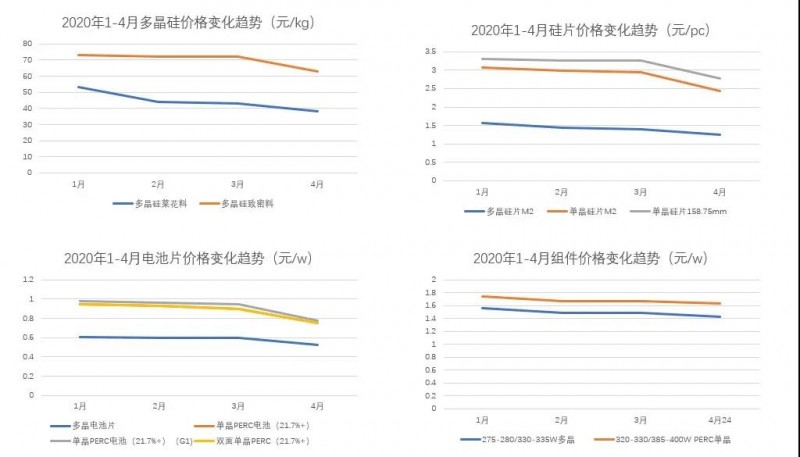 由于春節(jié)長假原因一季度為傳統(tǒng)裝機淡季,疊加國內(nèi)新冠疫情突發(fā)的影響,國內(nèi)市場需求下滑。3月下游光伏電站項目逐步復(fù)工復(fù)產(chǎn),但海外疫情隨之爆發(fā),對海外市場需求帶來了極大的不確定性。加之光伏行業(yè)技術(shù)進步繼續(xù)推進,導(dǎo)致光伏產(chǎn)品價格繼續(xù)下滑,如下圖所示。從多晶硅來看,4月開始,多晶硅價格快速下降,已經(jīng)低于部分老產(chǎn)能制造成本,產(chǎn)品價格由1月的53元/kg(多晶硅菜花料)和73元/kg(多晶硅致密料)降至目前的31元/kg和60元/kg。多晶硅片目前平均價格1.17元/片,單晶硅片G1和M6平均價格分別為2.63元/片和2.72元/片(PV Infolink 5月13日);組件價格在1.60元/W左右。由于3-4月多晶硅片市場需求量銳減,造成價格跌幅達20%-30%,硅片價格也面臨下行趨勢,3-5月隆基單晶硅片價格已經(jīng)經(jīng)歷連續(xù)四次下調(diào),單晶M6硅片從2月底的3.47元/片降至2.77元/片(隆基官網(wǎng))。