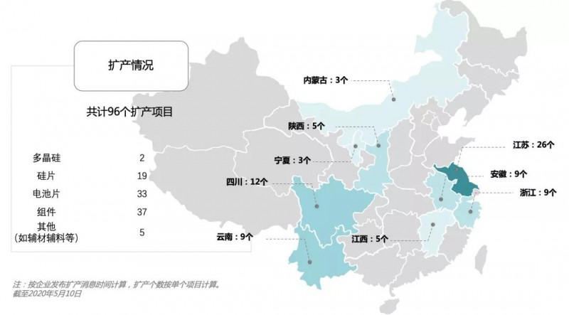 制造業(yè)擴產(chǎn)布局方面,呈現(xiàn)一定的區(qū)域性特點。其中多晶硅集中在西南地區(qū)的四川和云南兩大低電價省份;硅片環(huán)節(jié)在國內(nèi)的19個擴產(chǎn)項目有71%集中在西部地區(qū),如樂山、云南、寧夏等地,23%在內(nèi)蒙;電池片以及組件環(huán)節(jié)相比硅片來說市場集中度較低,因此其產(chǎn)能布局較為分散,多數(shù)企業(yè)都將產(chǎn)能集中在了以江蘇、浙江、安徽、江西為代表的長三角區(qū)域。