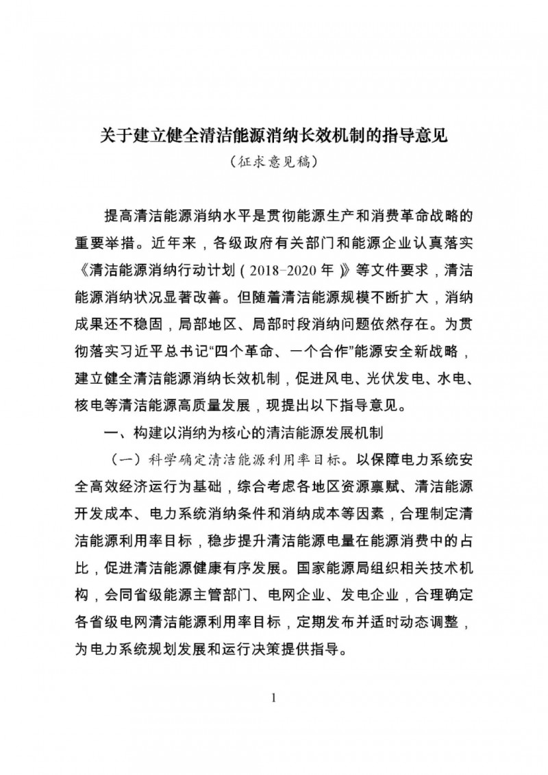 國家能源局綜合司關于公開征求《關于建立健全清潔能源消納長效機制的指導意見(征求意見稿)》意見的公告
