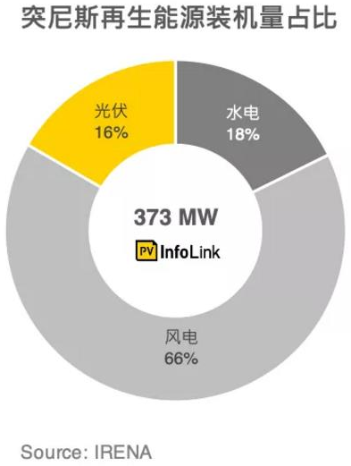 目前突尼斯整體再生能源裝機量為373MW,其中以風電的裝機量占比(66%)最高,其次則為水電(18%)及光伏(16%)。距離2030年3.8GW的裝機量目標尚有一段距離。