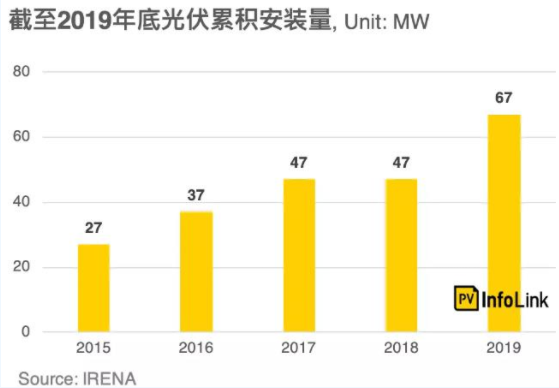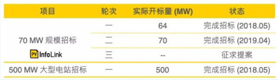 2017年由政府完成首輪70MW光伏招標,目前一共完成兩輪同等規模的招標計劃,共開出134MW的標案量,而第三輪目前則尚在招標階段。另外值得注意的是于2019年12月份國家更完成了首個規模500MW的光伏招標計劃。