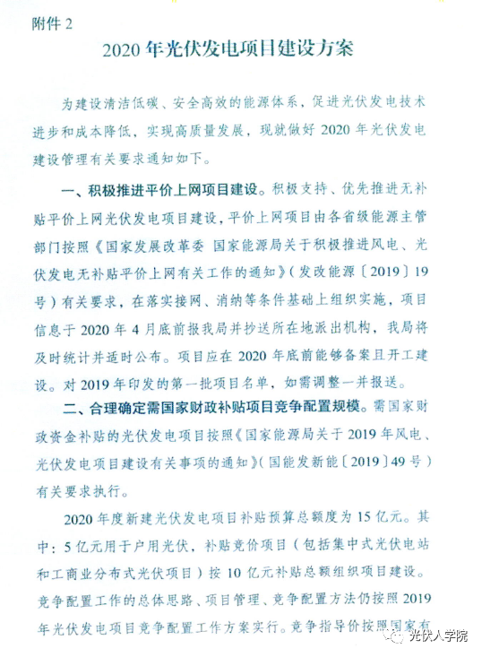 3月6日,國家能源局發布了關于2020年風電、光伏發電項目建設有關事項的通知中提到,2020年度新建光伏發電項目補貼預算總額度為15億元。其中:5億元用于戶用光伏,補貼競價項目(包括集中式光伏電站和工商業分布式光伏項目)按10億元補貼總額組織項目建設。