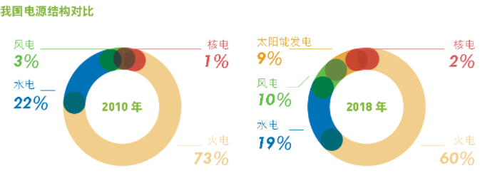 經過多年發展,我國電源結構得到明顯改善。2010年我國火電裝機容量占比73%,風電裝機占比僅為3%。2018年我國火電裝機容量占比下降到了60%,新能源裝機容量占比增加到了19%,清潔能源裝機占比達到了40%。