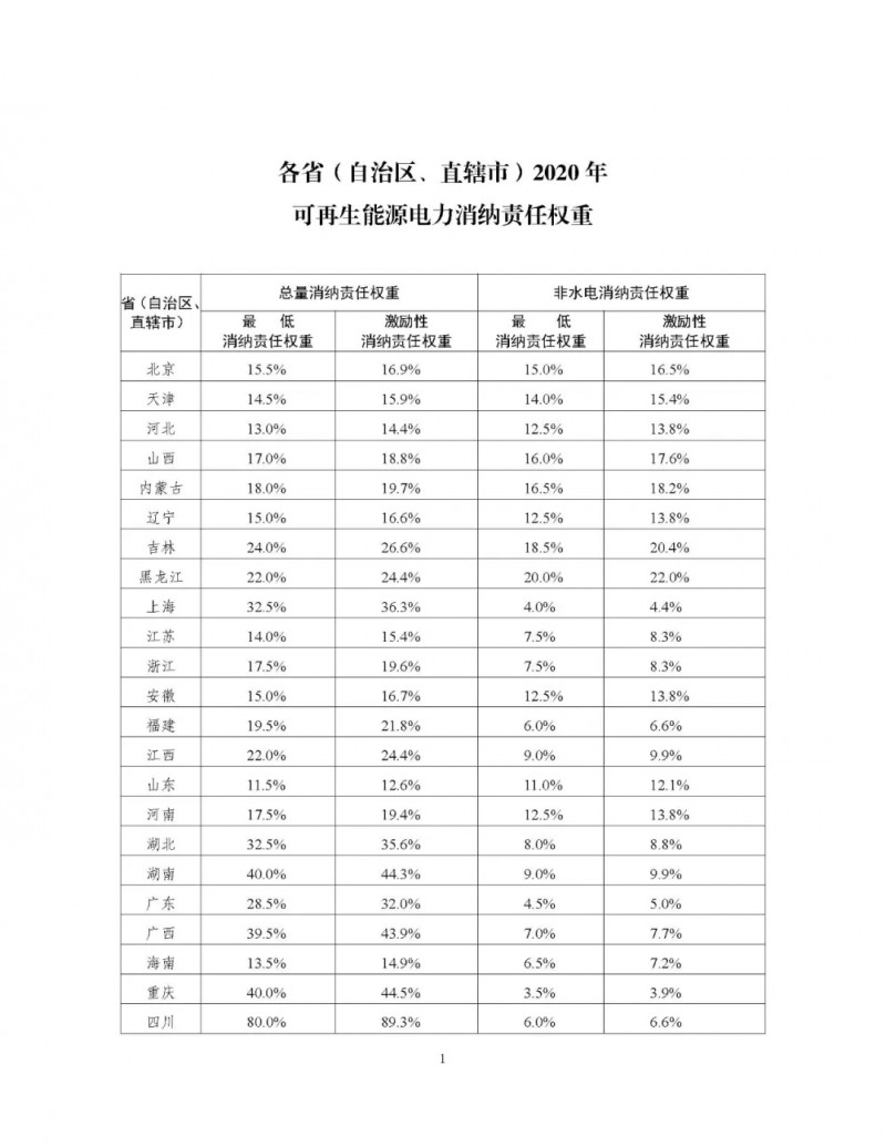 國家發展改革委 國家能源局關于印發各省級行政區域2020年可再生能源電力消納責任權重的通知