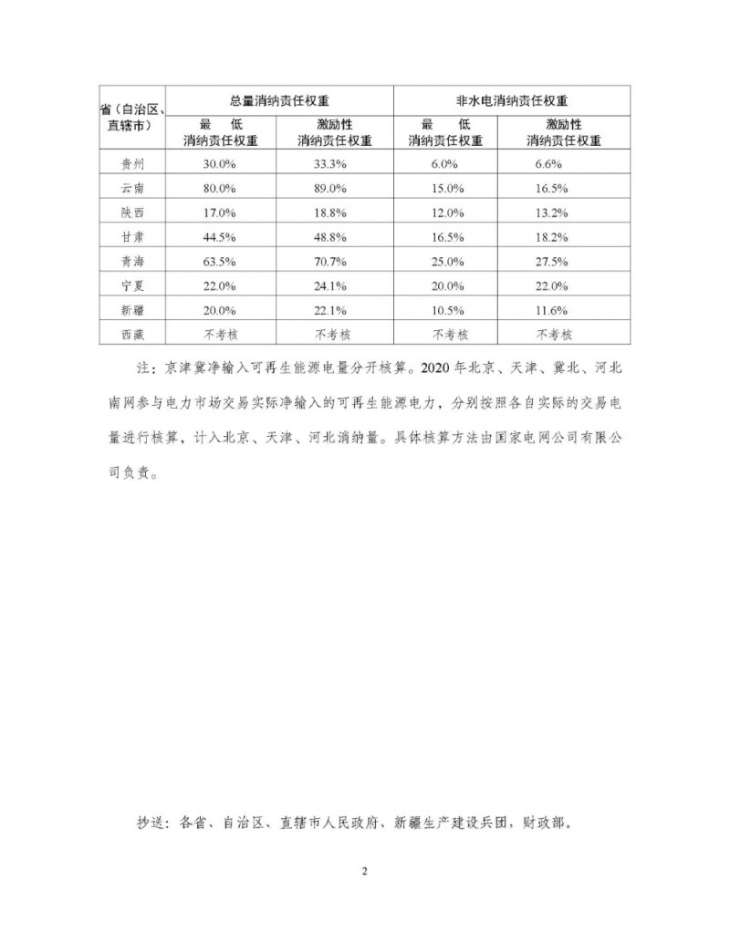 《通知》明確了各省(區、市)2020年可再生能源電力消納總量責任權重、非水電責任權重的最低值和激勵值,西藏以可再生能源為主,807號文明確不予考核。