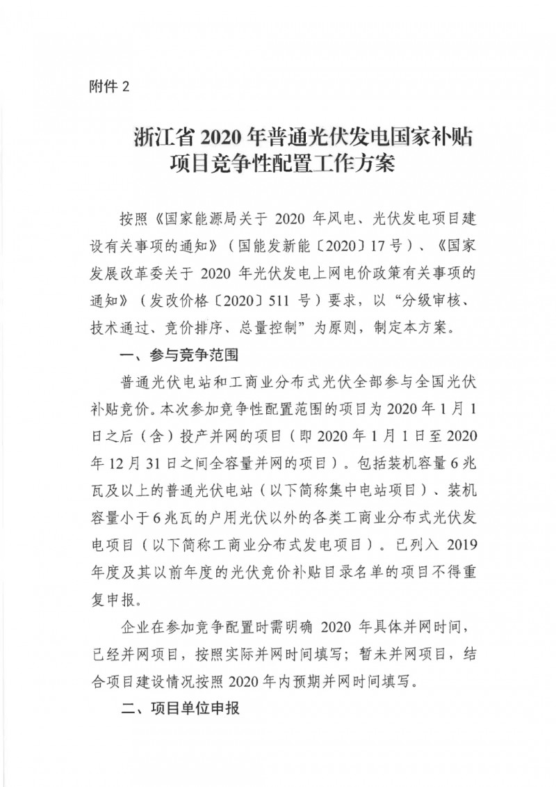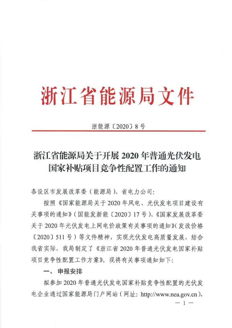 核心提示:浙江發布2020年光伏發電國家補貼競爭性配置工作的通知