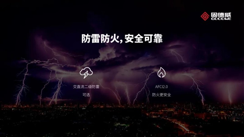 由于戶用光伏電站大多是安裝在家庭的屋頂上的,所以電站的安全變成了頭等大事,一但發生事故后果不堪設想。為保障客戶生命財產安全,固德威在設備安全方面做了頗多付出,現在已經開發出AFCI2.0(直流拉弧檢測),25kW機型可以加裝選配,直流拉弧檢測不誤報、不漏報,幾乎100%保障直流側安全。另外,25kW機型在直流側和交流測都有防雷設置,杜絕雷擊隱患,防雷更安心。