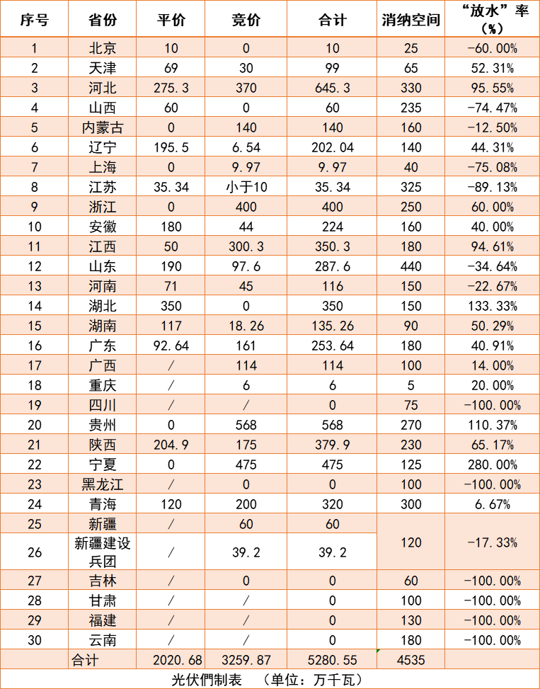 從上表數據可以看出,河北、江西、寧夏等省份的競價規模遠超電網公司給出的2020年新增光伏消納空間。