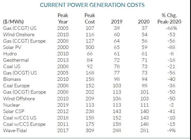2010年成本達峰:15.8美分/千瓦時;2020年成本:9.4美分/千瓦時;2050年預測成本:8.9美分/千瓦時