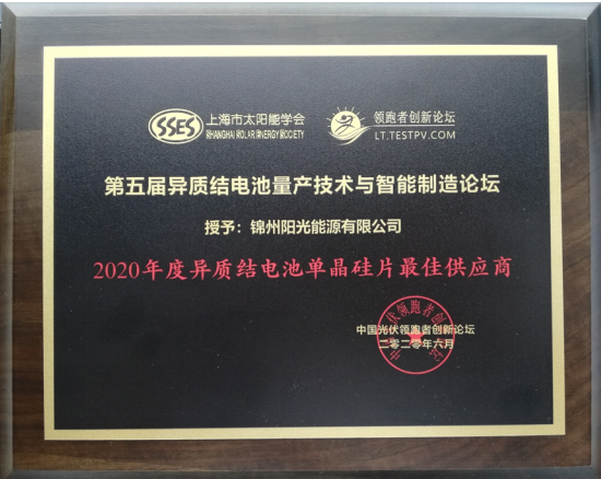 6月19日,由上海市太陽能學會、光伏領跑者創新論壇聯合主辦,中國質量認證中心、加拿大標準協會(CSA)提供技術支持的“第五屆異質結電池與裝備產業化發展論壇”在蘇州吳宮泛太平洋酒店圓滿落幕。為鼓勵推動異質結電池產業化發展做出卓越貢獻的優秀企業,大會頒發了2020年度異質結電池單晶硅片最佳供應商獎,錦州陽光憑借扎實可靠的產品制造能力獲得了行業專家的高度認可,載譽異質結電池單晶硅片最佳供應商。