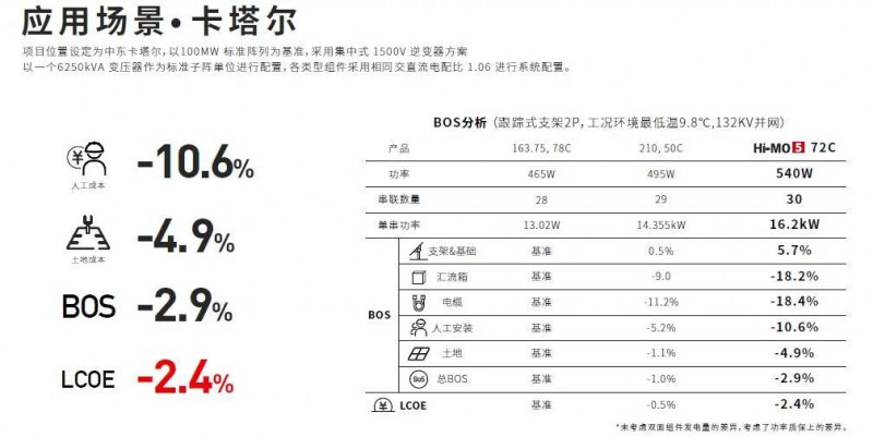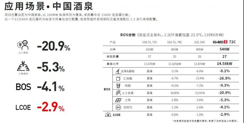 對于182mm,隆基推出的新品Hi-MO5,量產(chǎn)功率可以達(dá)到540W。據(jù)了解,從2019年底開始立項(xiàng)研究,歷時(shí)6個(gè)月研究,通過市場調(diào)研、長時(shí)間的驗(yàn)證與謹(jǐn)慎的推理,反復(fù)推導(dǎo),最終在今年四月定型。此前,隆基也已就該尺寸與同行企業(yè)進(jìn)行了充分的溝通,從各家近期發(fā)布的新品來看,各家也在朝著一致的方向前進(jìn),更為重要的是,尺寸的統(tǒng)一也將給下游客戶帶來價(jià)值最大化。隆基182mm產(chǎn)品工作電流約13A,完美適配現(xiàn)有逆變器;疊加雙面技術(shù)后,工作電流仍控制在新一代逆變器的最大輸入電流范圍內(nèi),有效避免發(fā)電損失。72版型組件尺寸為2256×1133mm,重量為32.3kg。