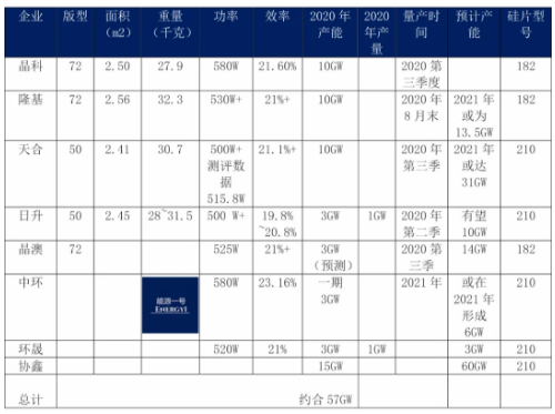 2020年2月28日,環晟光伏3GW高效太陽能疊瓦組件廠開工,6月18日下線了首塊組件,組件效率高達21%以上,輸出功率最高可超600W,項目計劃今年整體產能達到3GW,2020年出貨量預計達到1GW。因此兩家公司整體的210組件或許會在明年超過10GW的產能。