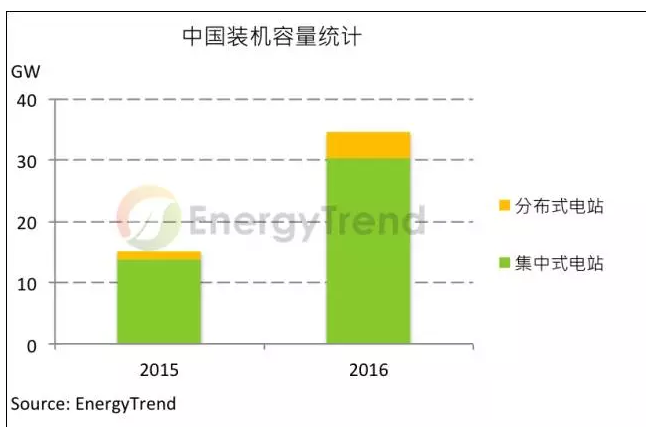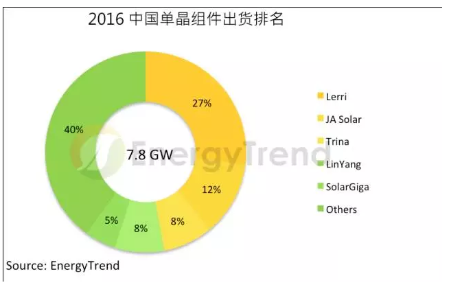 去年最受矚目的單晶風(fēng)潮實(shí)際也大有起色,在領(lǐng)導(dǎo)廠商將常規(guī)單晶與多晶組件價(jià)差控制在US$ 0.01 / W的推動(dòng)之下,單晶產(chǎn)品藉由高性價(jià)比,在過去以多晶為主的中國市場成長至市占超過25%,雖樂葉、晶澳、天合仍為中國內(nèi)需單晶組件主要供貨商,但有越來越多的電池片、組件供貨商在去年加入單晶戰(zhàn)局,使得前述三大供貨商在中國內(nèi)需之單晶占比已略低于50%,也顯示單晶熱潮的蓬勃發(fā)展。
