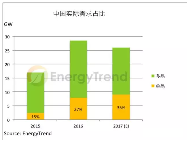 展望2017年,第一季受限于單晶硅片極度供不應(yīng)求,單晶市占的擴(kuò)充程度有限,不僅單多晶在硅片、電池片、模塊的價(jià)差也逐漸拉開,使得單晶產(chǎn)品之性價(jià)比優(yōu)勢不如去年,也有許多單晶訂單應(yīng)無法購得足夠之硅片,而協(xié)商以多晶交貨。然而,隆基、中環(huán)兩大單晶硅片供貨商的擴(kuò)產(chǎn)預(yù)計(jì)能在四月以后逐漸放量,使得單晶硅片缺貨情形能逐漸緩解。