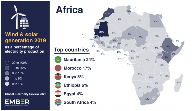 非洲2019年的電力結構中風能和太陽能占3%,低于全球平均水平。領頭羊是毛里塔尼亞(24%)、摩洛哥(17%)、肯尼亞(8%)和埃塞俄比亞(6%)。南非和埃及是電力需求量最大的兩個國家,風能和