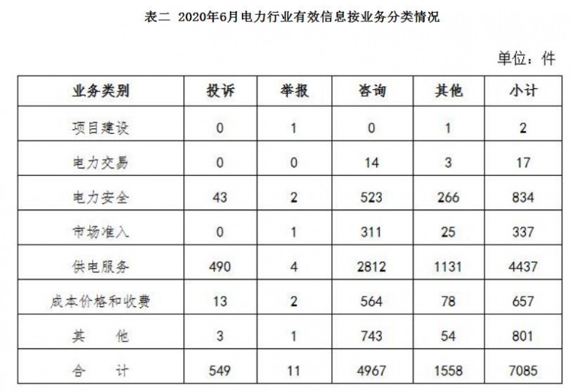 電力行業排在首位,有效信息數量為7085件,占全部有效信息的82.84%;其中受理的投訴舉報數量431件,占全部投訴舉報數量的74.70%。群眾反映問題主要集中在供電服務、電力安全、成本價格和收費等方面。(2020年6月電力行業有效信息按業務分類情況見表二)
