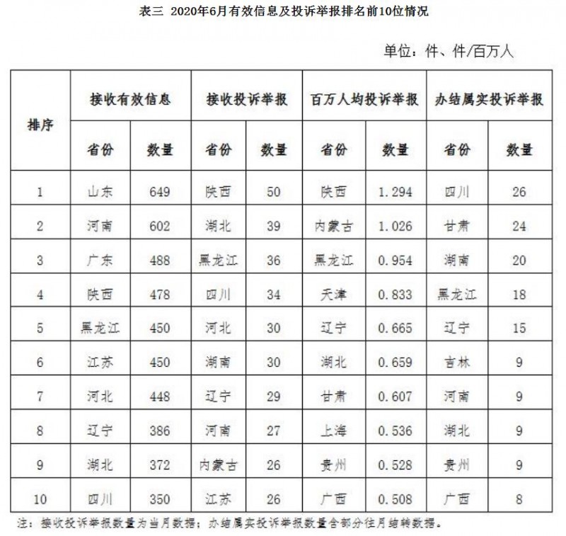 各省(自治區、直轄市)按照收到的有效信息數量排序,山東、河南、廣東、陜西、黑龍江、江蘇、河北、遼寧、湖北、四川等列全國前10位;按照投訴舉報數量排序,陜西、湖北、黑龍江、四川、河北、湖南、遼寧、河南、內蒙古、江蘇等排在全國前10位;按照百萬人均投訴舉報數量排序,陜西、內蒙古、黑龍江、天津、遼寧、湖北、甘肅、上海、貴州、廣西等排在全國前10位;按照辦結屬實投訴舉報數量排序,四川、甘肅、湖南、黑龍江、遼寧、吉林、河南、湖北、貴州、廣西等排在全國前10位。(2020年6月有效信息及投訴舉報排名前10位情況見表三)