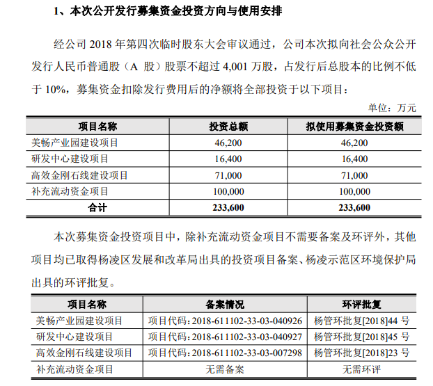 據(jù)招股書顯示,美暢股份擬公開發(fā)行A股不超過4001萬股,擬募資金額23.36億元,主要投資于美暢產(chǎn)業(yè)園建設(shè)項(xiàng)目、研發(fā)中心建設(shè)項(xiàng)目、高效金剛石線建設(shè)項(xiàng)目以及補(bǔ)充流動資金項(xiàng)目。本次募投的高效金剛線建設(shè)項(xiàng)目,計(jì)劃總投資7.1億元,預(yù)計(jì)建設(shè)期為24個月,將通過租賃生產(chǎn)車間及倉庫,購置先進(jìn)的自動化生產(chǎn)線、檢驗(yàn)設(shè)備及環(huán)保設(shè)施等,新增高效金剛石線年生產(chǎn)能力 1,500 萬公里。