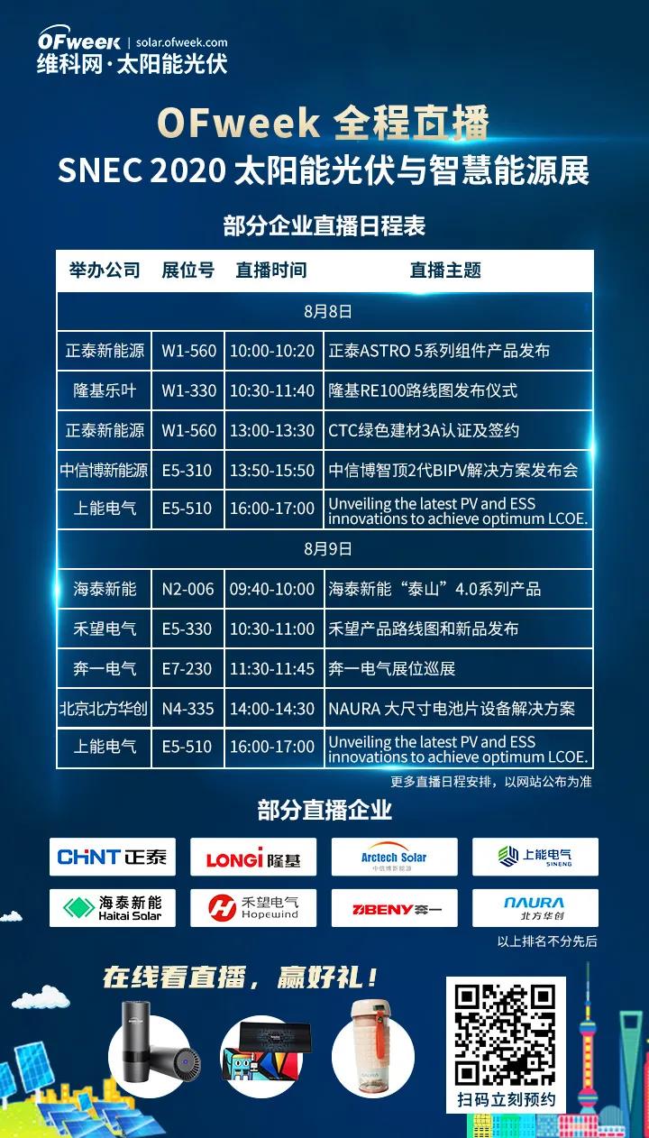8月8日-8月9日,鎖定OFweek直播間,全程見證企業帶來干貨滿滿的技術講解及新品發布會。此外,OFweek太陽能光伏網還將帶來實時現場圖文報道,敬請關注!