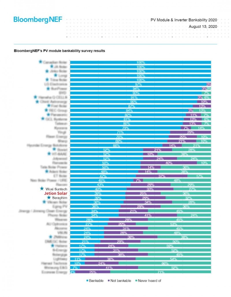 此次BNEF發布的評選報告主要針對全球49家知名光伏組件制造商的融資價值展開。他們面向全球金融機構(銀行、基金)、項目開發商(EPC)、獨立電力生產運營商等光伏行業利益相關方發出問卷調查表,并與質量檢測和技術專家進行深度訪談,調研范圍覆蓋全球76 GW的光伏產品。