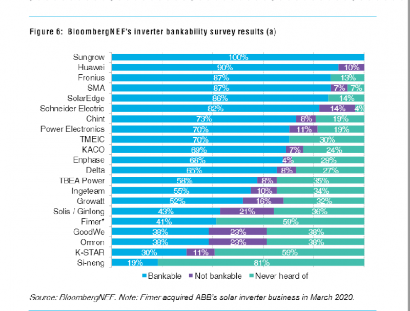 就逆變器領域而言,陽光電源無疑是最大贏家,連續兩年蟬聯“全球最具融資價值逆變器品牌”冠軍,是唯一被所有參與者認定為“bankable”(可融資)的逆變器企業。這意味著光伏電站采用陽光電源逆變器更容易獲得銀行融資和無追索權貸款。此外,Fronius和Power Electronics的可融資性有所提升,華為則出現小幅下滑,融資存在不確定性。