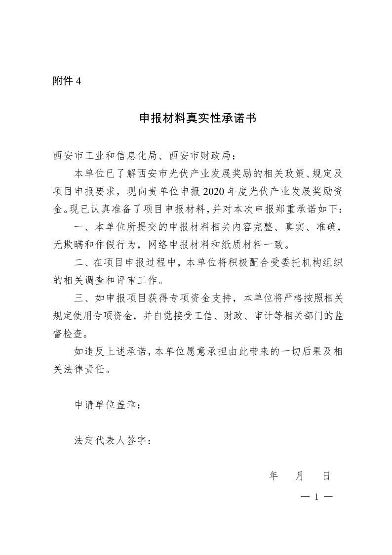 2.企業(yè)申請報告。申報企業(yè)以正式文件向市工信局、市財政局提交“關(guān)于申請西安市2020年光伏產(chǎn)業(yè)發(fā)展獎勵的報告”(申請報告格式見附件2)。