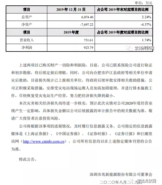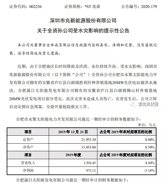 近期,由于合肥地區長時間降雨及洪澇,水位持續升高。受水災影響,深圳市兆新能源股份有限公司(以下簡稱“公司”)全資孫公司合肥市永聚太陽能電力開發有限公司擁有的安徽省廬江縣白湖鎮勝利圩種養殖基地20MW光伏電站被洪水淹沒,合肥晟日太陽能發電有限公司擁有的安徽省廬江縣白湖鎮梅山村養殖基地 20MW光伏發電項目部分受災,此次災害未造成人員傷亡,災害發生后,公司立即 啟動災情應急預案,全面開展搶險救災工作。