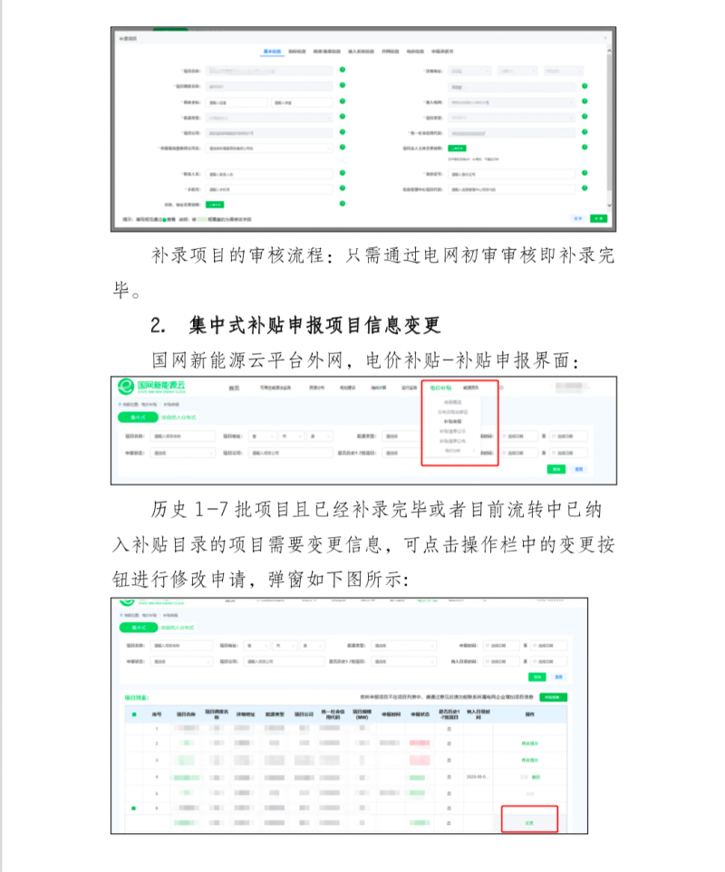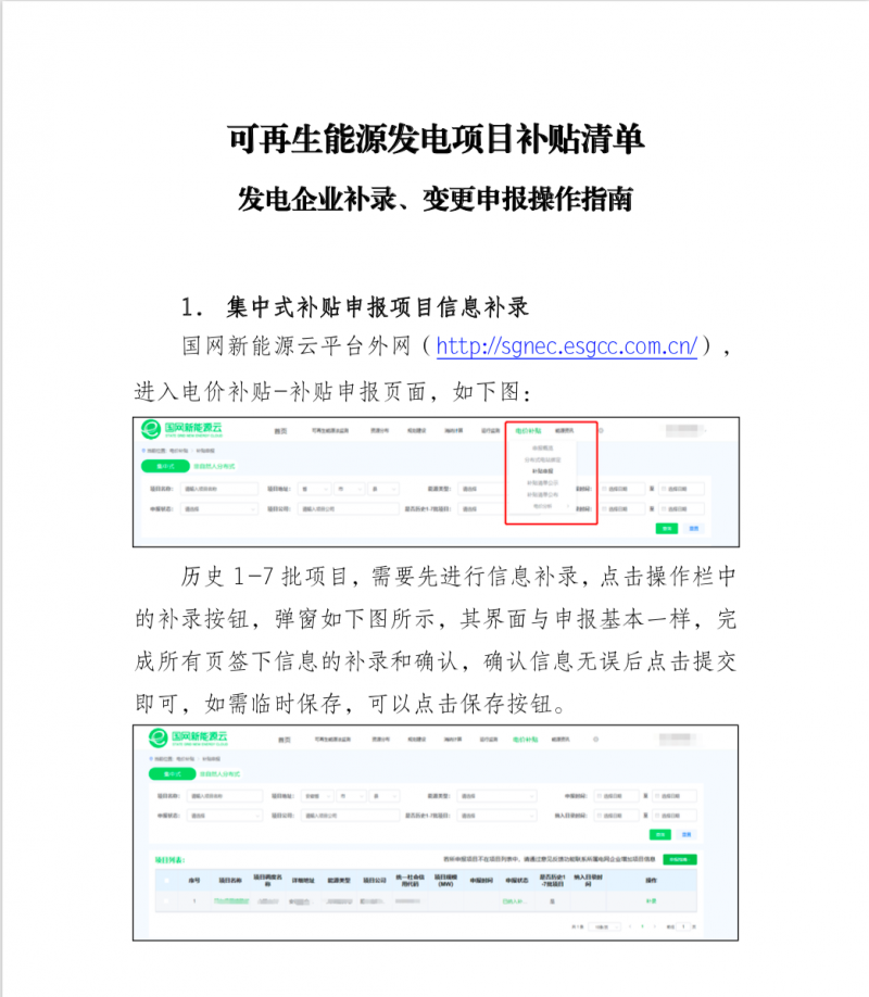 對(duì)于已納入1-7批補(bǔ)貼目錄項(xiàng)目,如項(xiàng)目名稱、業(yè)主、容量、場(chǎng)址發(fā)生變更,項(xiàng)目業(yè)主可通過國(guó)網(wǎng)新能源云平臺(tái)(網(wǎng)址:http://sgnec.esgcc.com.cn)開展目錄項(xiàng)目信息變更工作。其中,項(xiàng)目名稱、業(yè)主信息變更,由各省電力公司審核后進(jìn)行公示、公布;項(xiàng)目容量、場(chǎng)址信息變更,需重新申報(bào)納入補(bǔ)貼清單。用戶操作手冊(cè)詳見附件。