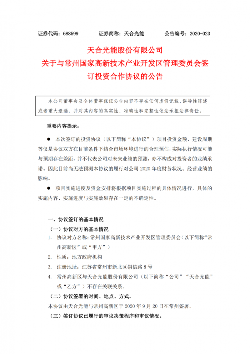 光伏行業推進了500W+、600W+超高功率時代。將在常州高新區開展年產15GW的大功率高效組件項目,投資總額不超過30億元人民幣,其中設備投入不超過15億元人民幣。預計2020-2023年建設完成。
