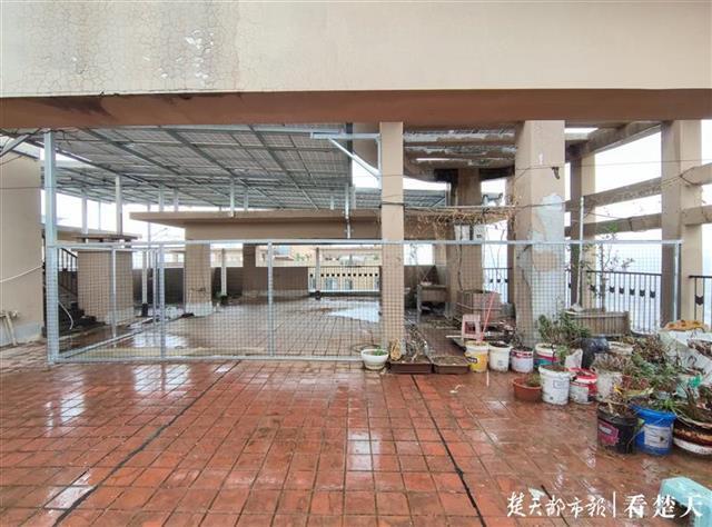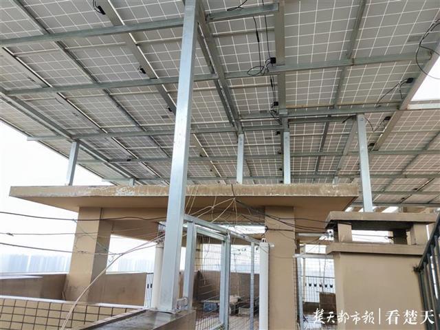 21日上午,楚天都市報記者在該小區1棟2單元樓頂天臺看到,光伏發電站的面板安裝天臺上,用鋼架結構固定,就像給天臺加蓋了頂棚,電站區域還用鐵絲網圈圍起來。