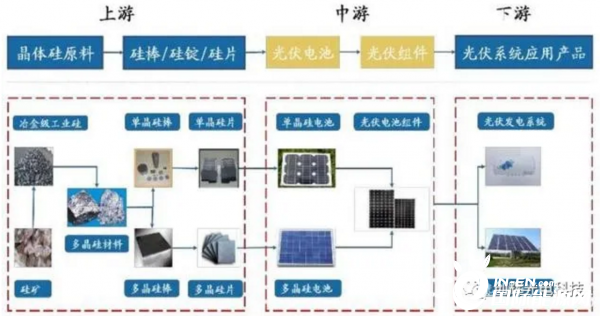 太陽能光伏產業鏈由三大環節組成,分別為:上游硅料和硅片,中游電池片和下游組件,以及最終端的光伏電站。