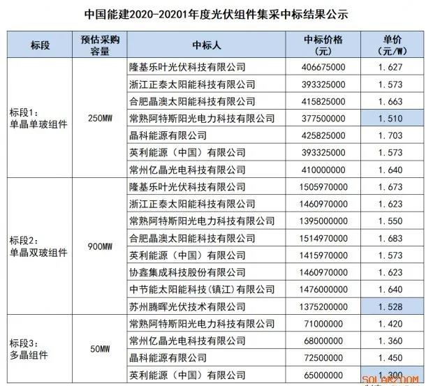 第二標(biāo)段采購900MW單晶雙玻組件,最低中標(biāo)價格為騰暉光伏,折合單價1.528元/W。