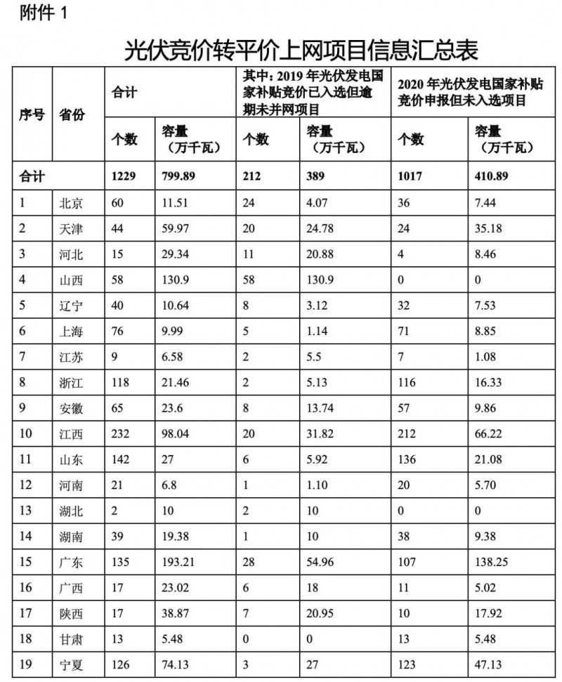 根據《國家能源局綜合司關于報送光伏競價轉平價上網項目的通知》要求,結合各省級能源主管部門報送項目信息,光伏競價轉平價上網項目共1229個、裝機規模799.89萬千瓦,現予公布。