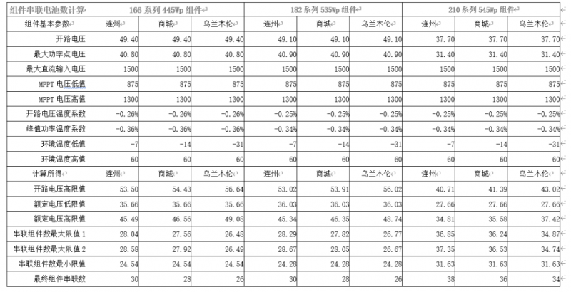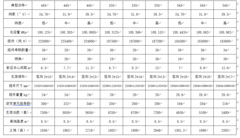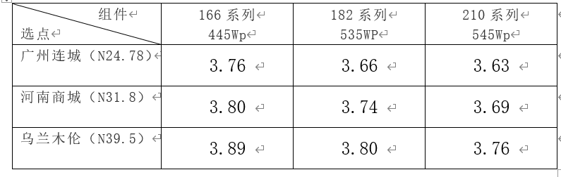 為此,山東電力工程咨詢院有限公司針對目前市面上主流的組件類型(166型445Wp組件、182型535Wp組件、210型545Wp組件),以及不同緯度(北緯24.8°廣州連城、北緯31.8°河南商城、北緯39.5°內蒙烏蘭木倫)的資源環境條件,做了詳細的工程量計算、成本分析和投資收益對比,具體對比如下: