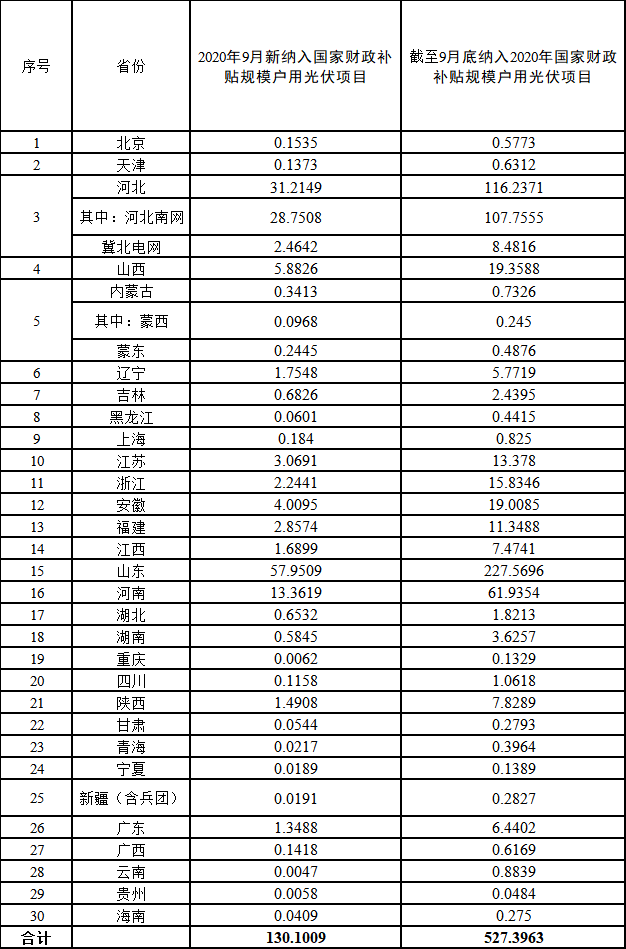 根據(jù)各省級能源主管部門、電網(wǎng)企業(yè)報送信息,經(jīng)國家可再生能源信息管理中心梳理統(tǒng)計,2020年9月新納入國家財政補貼規(guī)模戶用光伏項目總裝機容量為130.1萬千瓦。截至2020年9月底,全國累計納入2020年國家財政補貼規(guī)模戶用光伏項目裝機容量為527.4萬千瓦。詳細情況見附表。