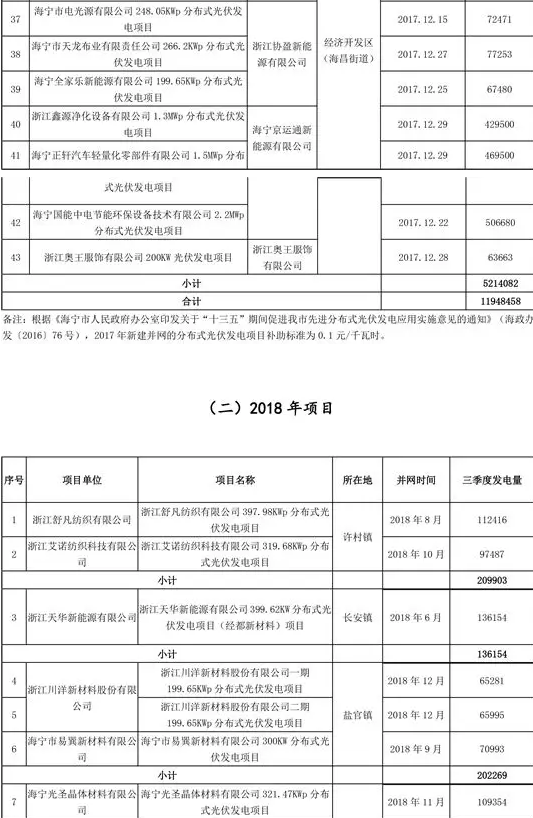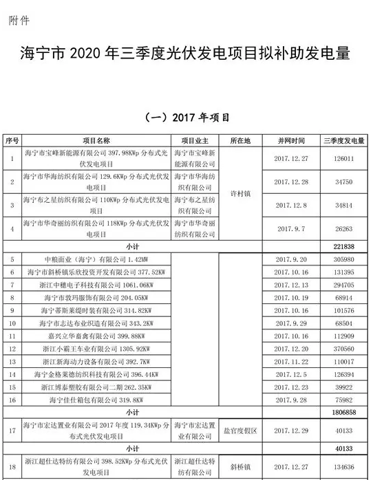 附件:海寧市2020年三季度光伏發電項目擬補助發電量