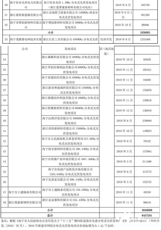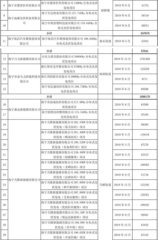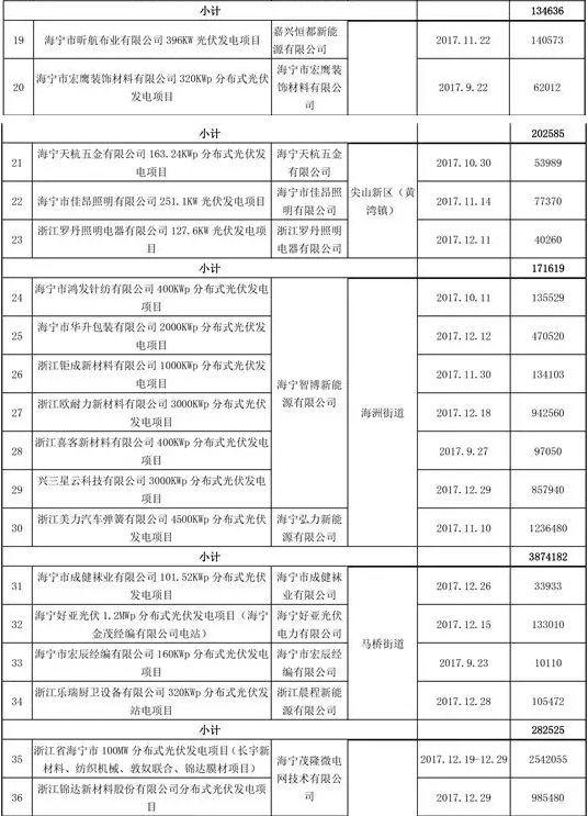 浙江海寧市公示2020年三季度光伏發電項目擬補助發電量