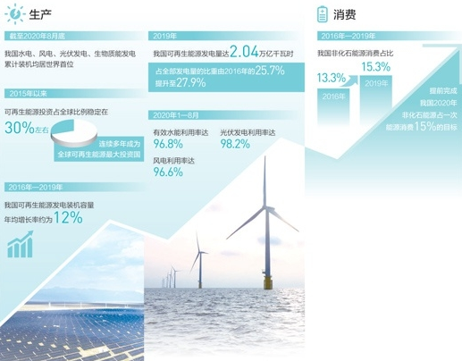 利用水平不斷提升。2019年,我國可再生能源發電量達2.04萬億千瓦時,占全部發電量的比重由2016年的25.7%提升至27.9%。今年1—8月,有效水能利用率達96.8%、風電利用率達96.6%、光伏發電利用率達98.2%。