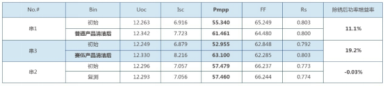 將組件根據電池排布及電學連接,分為3串,每串為相鄰的10片電池,共20片串聯連接的電池,對應接線盒內的一個旁路二極管。串1采用普通清潔產品進行清潔;串2未做清潔處理,便于清潔前后比對;串3采用賽伍的玻璃表面清潔產品CyClean-1。串1區域,采用普通清潔產品后,組件玻璃表面仍存在發黃現象。串3區域,采用賽伍清潔產品CyClean-1清潔后,玻璃表面不存在發黃的現象,表面生銹的物質基本已經清洗干凈。表1是串1和串3在清潔后的功率變化。可以看出,無論是賽伍清潔產品Cyclean-1還是普通清潔產品在清潔后, 組件功率都有一定程度的恢復。數據顯示,使用普通清潔產品后,功率恢復11.1%;采用賽伍產品清潔后,功率恢復19.2%,同比普通清潔產品增長73%。